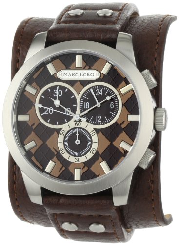 The preppy Marc Ecko Prescott allows the man to still be hip and cool with an urban edge. The brushed and polished stainless steel case contains a brown argyle patterned dial with chronograph movement. The brown leather cuff has two grommets on each side of the strap connecting to the round 47mm case.